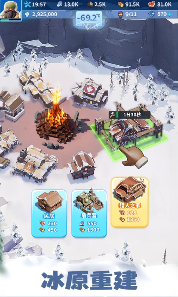 光活着还不够,你得让一群人活得有希望。这就是无尽冬日的经营核心——城镇建设。一开始你可能就一个破木屋,几口人挤着取暖。但随着资源积累,你可以盖起粮仓、伐木场、铁匠铺,甚至还能建医院和兵营。建筑布局也有讲究,不是随便摆就行。比如取暖设施得靠近居民区,防御塔得卡住敌人进攻路线。更妙的是,游戏里的建筑风格是欧美卡通风,看着圆滚滚的小房子冒着热气,烟囱里飘着炊烟,明明是末日,却有种莫名的治愈感。很多人玩着玩着就忘了自己在打打杀杀,反而沉迷于怎么把自己的小镇布置得更有生活气息。