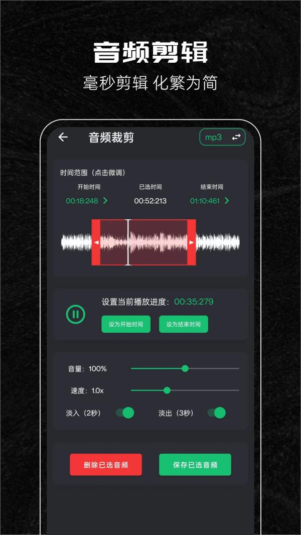 很多人没注意到,这软件自带即时录音功能。开会、上课、采访、记灵感,掏出手机点一下就开始录,声音清晰不卡顿,文件自动保存进本地列表,随时能剪能改。录完还能直接编辑,比如去掉中间的空白段、降噪处理、转成MP3发给同事。最关键的是,录完的音频可以直接设成闹钟铃声或通知提示音,早上被自己录的“起床啦!”叫醒,一天都精神!这哪是APP,简直是随身音频工作室。