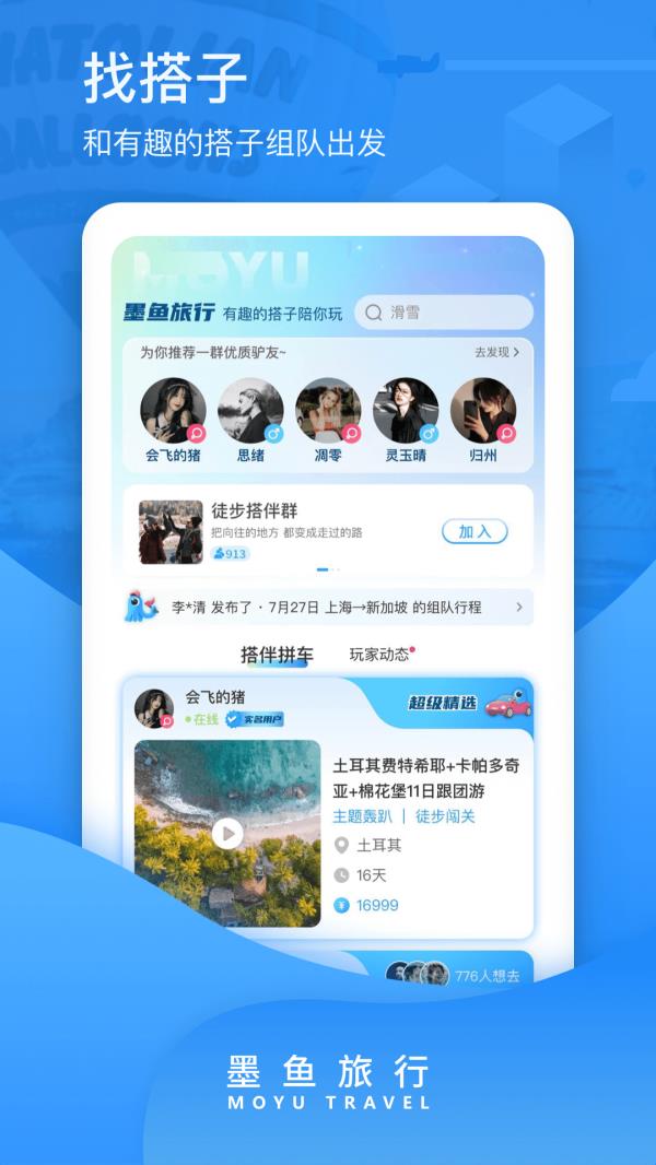 市面上的旅行APP不少,但大多数都在解决“去哪儿”“怎么订票”的问题,却很少有人关心“和谁去”。而墨鱼旅行偏偏就盯准了这个被忽略的痛点。它不像传统平台那样只推路线和优惠,而是主打“社交+旅行”的新模式。你可以把它理解成一个会帮你“组局”的旅行伙伴。你想去大理发呆、去川西自驾、去潮汕吃遍小吃,只要在平台上发布你的行程想法,系统就会根据你的年龄、兴趣、出发地、旅行风格等标签,给你推荐最“同频”的队友。喜欢安静看书的文艺青年,大概率不会被匹配给热衷蹦迪的派对达人,这种细节上的用心,才真正让“搭子”变得靠谱。