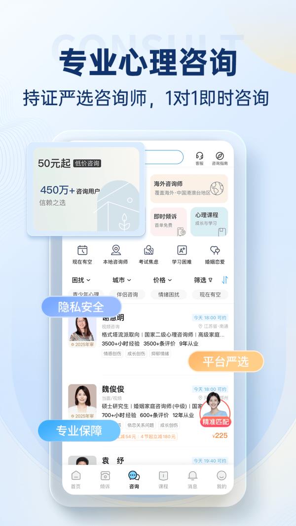 这是很多人担心的问题。毕竟网上啥人都有,万一碰上个半吊子,不仅白花钱,还可能被误导。但壹点灵在这方面把控挺严的。平台上所有的咨询师都经过实名认证和资质审核,很多都是国家二级心理咨询师,还有精神科背景的医生坐镇。你可以直接查看他们的从业年限、擅长领域、用户评价,甚至先听一段语音介绍再决定要不要约。整个过程透明,没有强制消费,也不会有人天天打电话骚扰你买课。更重要的是,它的咨询过程全程保密,不用担心隐私泄露。你说的话,只会留在这个安全的空间里。
