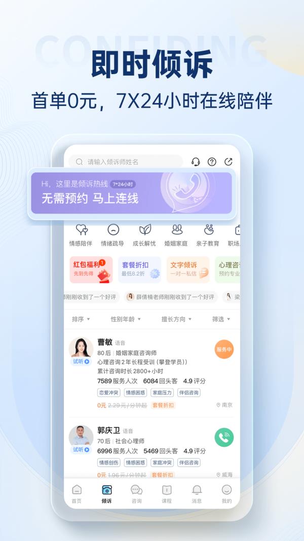别以为它只能处理“抑郁症”“焦虑症”这种标签化的问题。壹点灵的服务范围特别接地气:你想挽回一段快要凉掉的感情?有专门的情感咨询师帮你分析对方心理、调整沟通方式;你最近总是莫名烦躁、睡不好?可以找擅长情绪管理的老师一起梳理源头;家里娃不听话、学习拖拉,亲子教育顾问能教你既不吼也不宠的科学方法;还有职场人际关系、自我认知提升、原生家庭创伤修复……你能想到的情绪困扰,基本都能在这里找到对口的专家。而且它分两种模式:一种是即时倾诉,适合那种“我现在就想说话”的紧急时刻,接通很快,说完人就轻松了;另一种是一对一长期咨询,适合想要深度改变的人,系统化地陪你走过心理成长的每一步。
