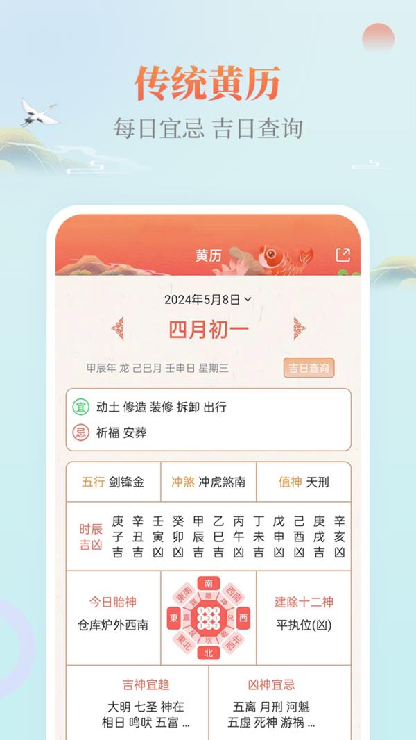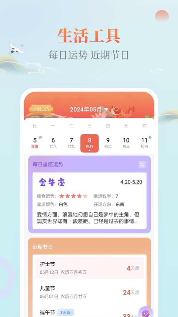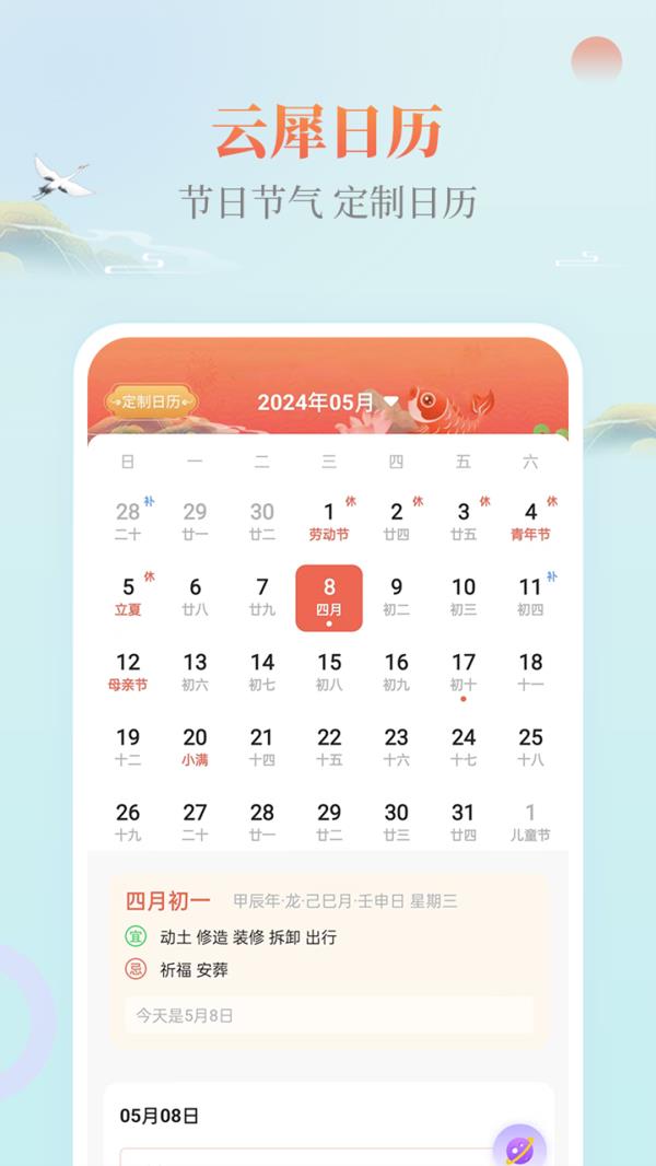 云犀日历可不是那种只能看看几月几号的“摆设型”应用。它从中国人实际需求出发,把农历、黄历、万年历这些传统元素都整合得明明白白。每天打开APP,当天是哪天农历、宜做什么、忌做什么一目了然。结婚、搬家、开业、动土这些大事,再也不用到处问人,直接在上面查个吉日就行,省心又靠谱。而且它还贴心地标注了二十四节气、传统节日、法定假日,连调休安排都能提前知道,帮你轻松规划拼假攻略,假期安排妥妥的。