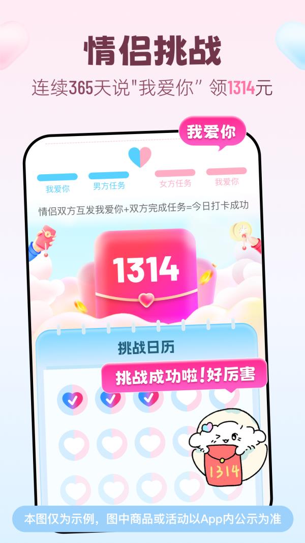 你有没有试过和对象约定每天说“我爱你”,结果坚持不到一周就断了?恋爱记的1314打卡功能,就是专门治这种“三分钟热度”的。它不是冷冰冰地提醒你打卡,而是把“互说爱你”变成一种期待。每打一次卡,就像给你们的感情账户存了一笔“爱的利息”,连续365天打卡还能拿1314元现金奖励——这哪是打卡,这是在为爱情攒彩头啊!而且系统会自动生成打卡日历,翻一翻过去的记录,你会发现原来你们已经说了这么多遍“我爱你”,那种被爱包围的感觉,真的会上瘾。
