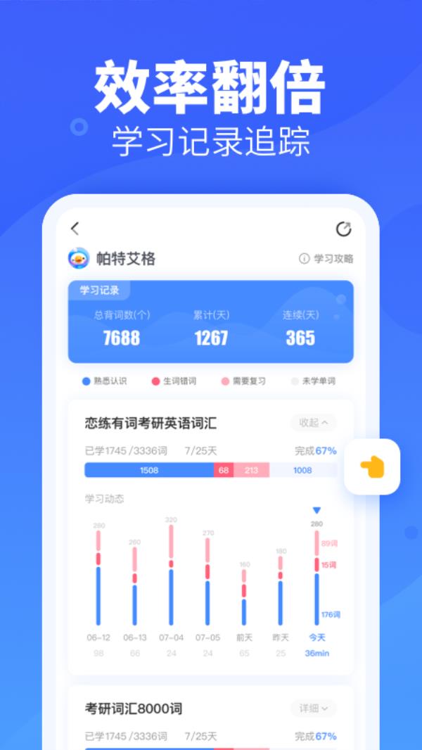 很多人背单词坚持不下去,不是因为懒,而是过程太痛苦。翻来覆去就那几个词,记了又忘,忘了再记,越背越挫败。乐词通过闯关式学习、打卡奖励、进度可视化等方式,把枯燥的任务变成了有点像玩游戏的过程。每完成一轮复习,系统都会给你反馈:“今日掌握XX词,战胜了全国85%的用户”,这种正向激励特别提气。而且每个单元结束后还有小测试,边学边测,效果立马看得见。你会发现,以前觉得遥不可及的5500词、8000词,居然不知不觉就啃下来了。